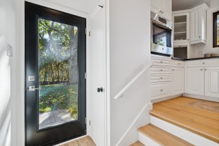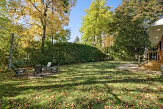 donnant sur la terrasse et la cour arrière verdoyante.