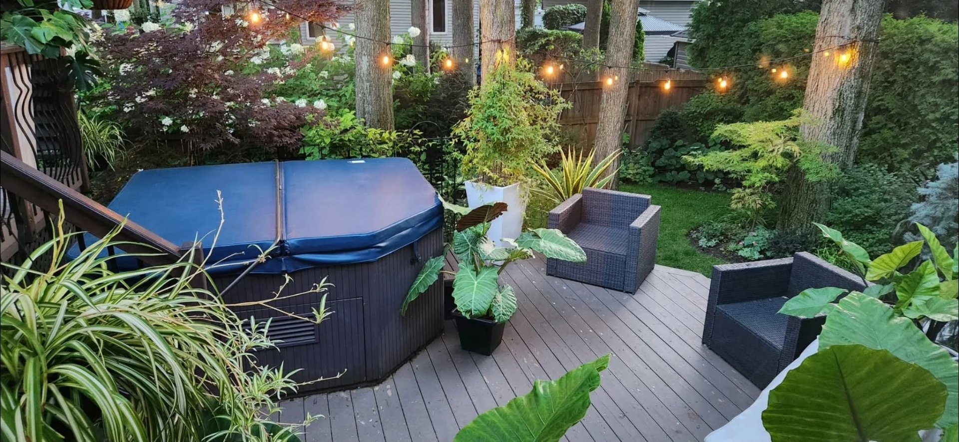 Aménagement du terrain Clôturé, Patio, Paysager, Terrain/cour bordé de haies